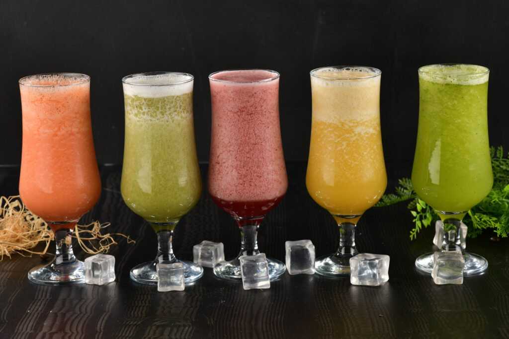 Taze portakal suyu, muz, çilek ve çilek sosu ile